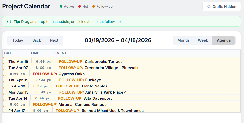 - Draft Management: The “Drafts Hidden” toggle allows you to clean up your view, focusing only on confirmed follow-ups while keeping internal notes tucked away until they are needed.
