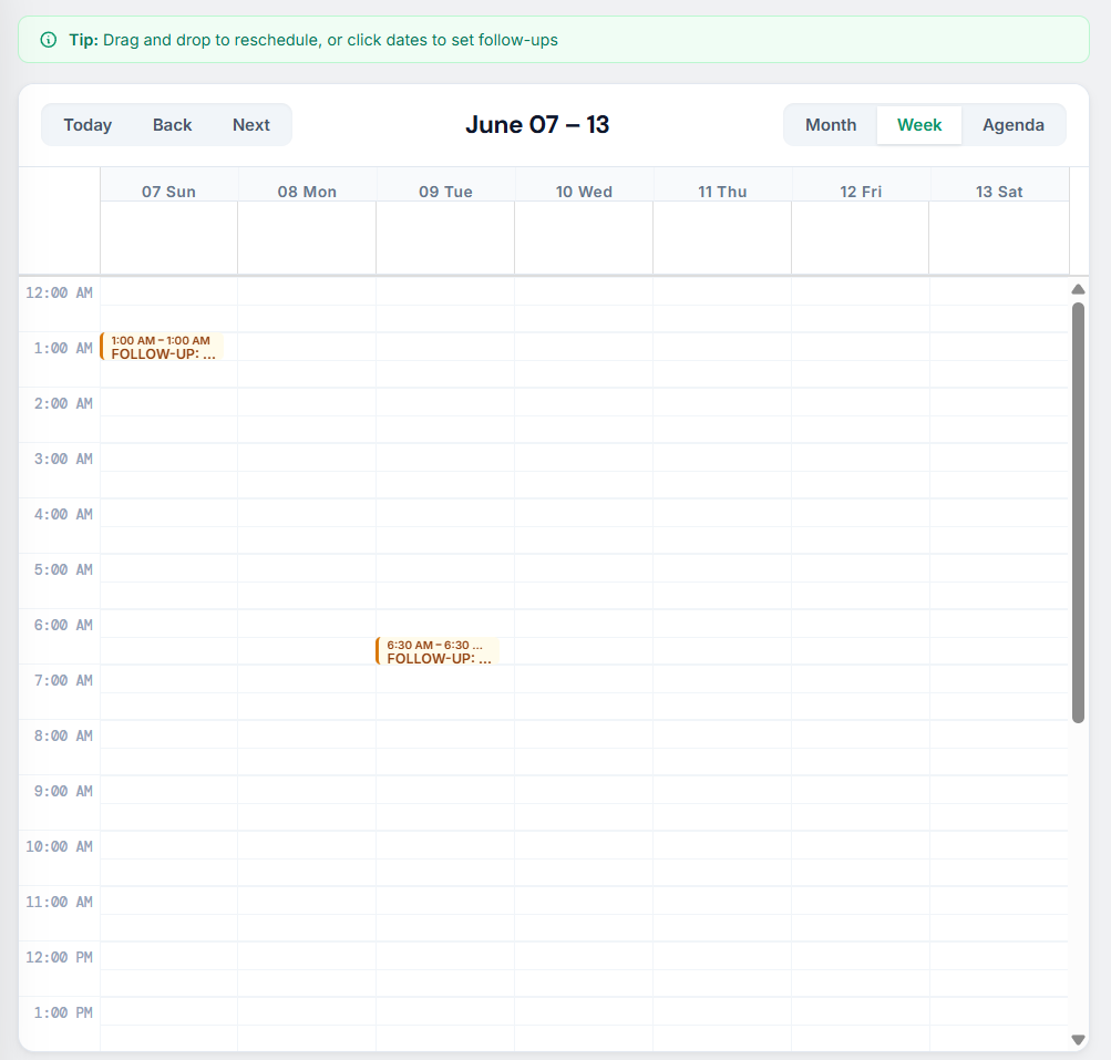 - The Week View (Tactical Execution): Ideal for detailed time management, the Week View breaks down follow-ups by the hour. This is particularly useful for scheduling specific calls or meetings, allowing you to see exactly when your day is blocked out for client outreach.