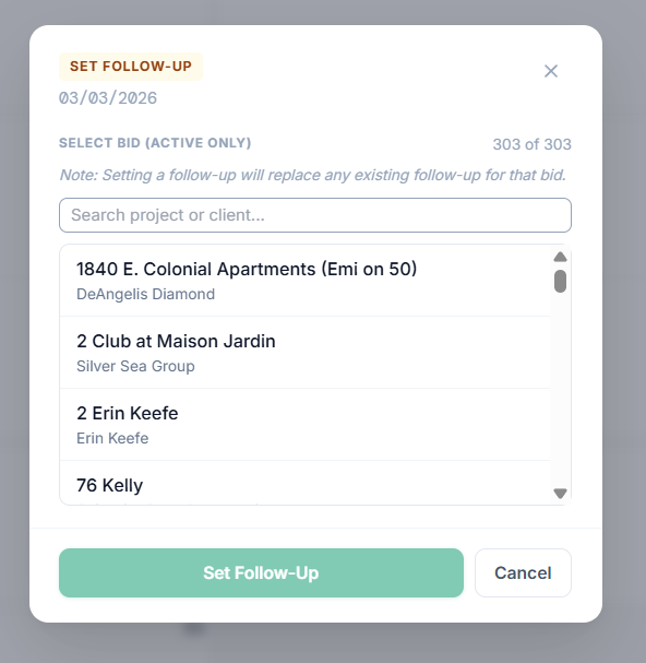 - Smart Overwrites: The system notifies you that setting a new follow-up will replace any existing one for that specific bid, preventing double-booking or redundant tasks.